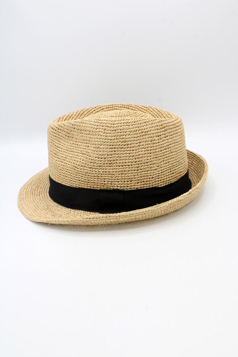 This stylish unisex trilby hat is handcrafted from 100% raffia straw with a natural finish and a refined navy grosgrain band. Lightweight, breathable, foldable, and perfect for travel, it blends comfort with timeless design.